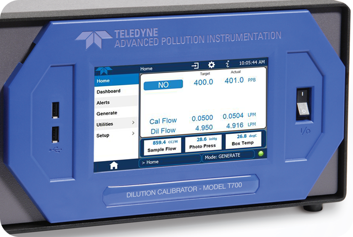 The Model T700 is a microprocessor based calibrator for precision gas analyzers. Using highly accurate mass flow controllers combined with compressed sources of standard gases, calibration standards are provided for multipoint span and zero calibrations using up to 4 gas sources. The Model T700 can be equipped with an optional UV ozone generator for accurate, dependable ozone calibrations, and to enable production of NO2 when blended with NO gas in the included, internal gas phase titration (GPT) chamber. An optional photometer allows even more precise control of the ozone generator giving accurate and dependable ozone calibrations and enhanced GPTs.  Learn More